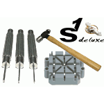 This handy set of watch band pin tools includes: bracelet holding block, set of 3 pins ( 0.60, 0.80 and 1.00mm) and a small ball pein hammer. This kit has the most popular tools needed to adjust a watch band or replace a watch clasp. It has a band block to hold the watch, leaving your hands free to work the punch pin and hammer. Block Size L53xW53xH26mm Learn More€19.99incl. VAT plus Shipping -