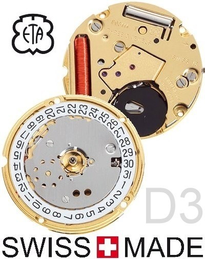 Modern and high-quality quartz watch movement ETA F03.115 HeavyDrive version manufactured in Switzerland as a replacement for wristwatches with 3 hands. Watch movement size: 7¾ lignes = Ø 17.20 mm. This quartz watch movement has 3 jewels and requires the following watch hands: 1.20/0.70/0.20 mm (hours, minutes, centre seconds). Total height of the watch movement: 2.50 mm, hour wheel height 1.24 mm. Date at 3 o'clock with corrector. The quartz watch movement uses battery type 371 (SR920SW). Battery lifetime up to 4 years. Important note for the replacement of an ETA quartz watch movement: only original movements from an authorised retailer guarantee the desired result of the watch repair. All ETA quartz movements are brand new and packaged safely.