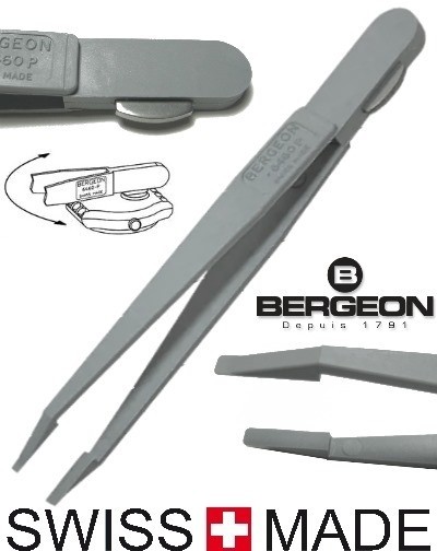 Bergeon 6460-P plastic tweezers are recommended for handling watch batteries during battery replacements. They are non-conductive and slightly flexible with flat tips for ease in picking up and handling a watch battery. These watchmakers tweezers give a nice firm grip on the watch cell when transferring the battery from the bench to the watch. The flat tips also provide maneuverability when inserting the watch battery into the movement. These watchmakers tweezers also feature a stainless steel lip for opening the battery hatch from Swatch watches. Length: 125 mm. Swiss made.