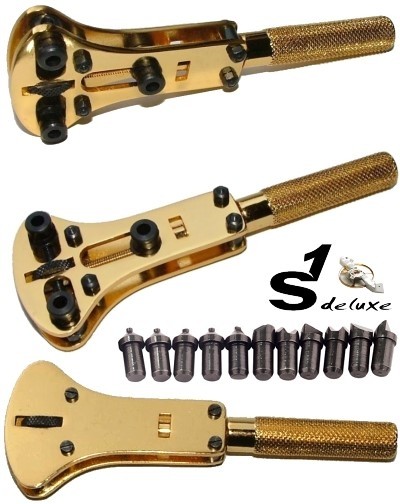 PREMIUM STAR watch case opener - the fine and easy way to open watch cases. For almost all branded watches and replicas. With this professional watch case opener and its 12 INSERTS (variably adjustable for almost all watches, 3 pins for slotted cases, 3 for cases with holes, 3 for polygonal cases and 3 for oyster cases) carrying out this work is a material-friendly piece of cake. The design (protected design AZ 404 05 321.1 in accordance with the German Design Act, exclusively available from this shop), is captivating not only due to its simple operation and elegance but also as a result of its longevity which is due to the special surface protection (gold coating). This tool is not just the right item for your premium watch but with its FINE APPEARANCE is also very eye catching!