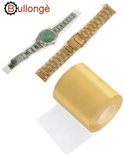 Adhesive foil roll BULLONGÈ 80 for protection of high class watches. This antistatic transparent protective film is perfect for wrist- and pocket watches, metal bracelets, buckles, watch case or other delicate watch parts. The ultra transparent film prevents and effectively protects the watches / parts of scratches, finger marks, dusts and other debris. Offers a guarantee of longer cleanliness of a new or a repaired item. Removes easily and will not leave sticky surface. Width: 80mm, thickness: 0.08mm, length 50m.