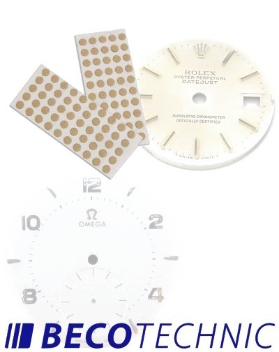 Self adhesive dial dots for sticking watch dials on to mechanical or quartz watch movements, where the dial feet are missing or where they do not match to the existing dial feet position when a movement has been replaced by different calibre. Consisting of 50 Ø3mm round self adhesive dots. This product has been specially developed for watchmakers. Manufacturer: Beco Technic, Germany.