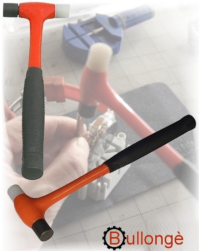 BULLONGÈ Swiss-Style II watchmaker's hammer with anti-slip-handle. Particularly designed for shortening watch straps in combination with a pin pusher or a watch strap shortening machine. Length 185mm, head length 57mm, handle width approx. 15mm. Colour: swiss red. This small and versatile hammer is our recommendation for all hobbyist watchmakers.