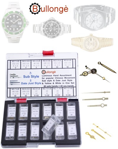 This watch hand assortment is the thing any watchmaker or watch repairer needs for their workbench. With these Submariner and Datejust style hands you can be sure to find just the hand you need to replace the existing watch hands. These are the most commonly used hands in RLX watches of the last 25 years. 80 sets watch hands, hour and minutes, plus 40 second hands, yellow and white color.