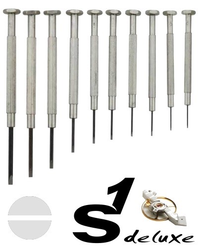 Set of 9 pcs S1 DELUXE ECO watchmakers screwdriver. You will never have to worry about what to do when you cant find that certain size screwdriver you need, just pull out this set and you have the complete range of common watch repair screwdriver sizes ranging from 0.50mm up to 2.30mm. The set comes packaged in a plastic storage pouch to keep all your screwdrivers organized and neat. This watchmakers screwdrivers have knurled, textured bodies for superior grip and rotating hex heads. Screwdrivers have an all-metal construction and are fixed blade style, meaning the blades are not replaceable.