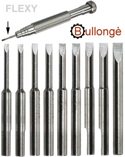 BULLONGÈ FLEXY L is a big set of 9 extra high quality spare blades for watchmaker screwdrivers BULLONGÈ FLEXY. Sizes: 0.6 up to 3.00 mm. Blades with a width of 0.5 to 1.0 mm are used for assembling mechanical watch movements, for repairing or cleaning movements, but also for removing the battery clamps from quartz watches etc.. Screwdriver-Blades 1.0 to 2.0 mm are used for unscrewing case clamp screws, watch case screws, watch band screws and screws from mechanical alarm clock mechanism etc.. 2.0 to 3.0 mm screws are found on movements of alarm clocks and table clocks, sometimes also in pocket watches, but rarely in wristwatches.