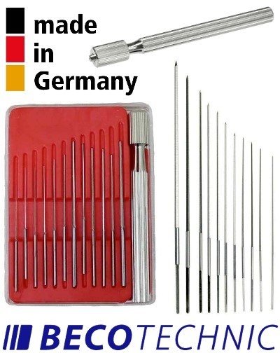 BECO TECHNIC MASTER TOOL SET, made in Germany, features a miniature pin vise and 12 tiny watchmakers broaches, made of high carbon cutting steel. Sizes 0.05mm - 0.07mm - 0.10mm - 0.15mm - 0.20mm - 0.25mm - 0.30mm - 0.35mm - 0.40mm - 0.45mm - 0.50mm - 0.55mm. The high quality mini broaches are five-sided and will help watchmakers increase the size of precision holes in metal material or to improve the surface of holes. Broaches are made from hardened steel for strong cutting and long lasting use, ideal for watch repair.