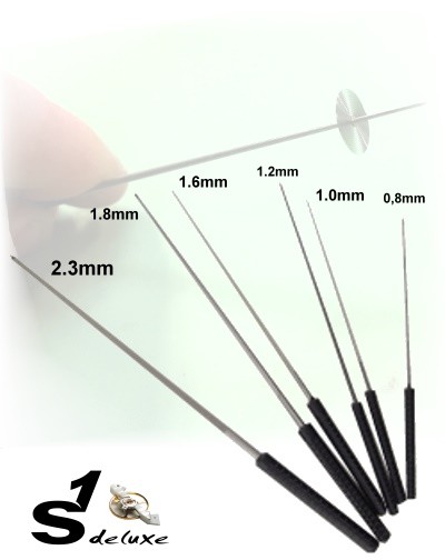 Set of 6 clock or watchmakers cutting broaches or reamers with plastic handle. Each steel broach is 5-sided for cutting and enlarging holes for example at watch cases or in links of metal bracelets. Used also for repairing pivot holes ans great for opening up holes on clock plates and then bushing. Cutting broach sizes 0.80mm up to 2.30mm. This assortment of cutting broaches belongs in every watchmaker's workshop. Made by Bullongè.
