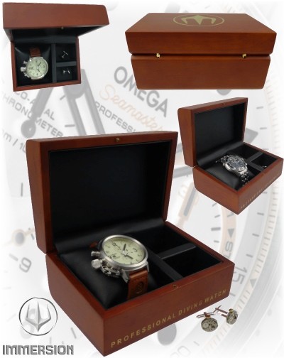 Elegantly designed watch box IMMERSION ORGANIZER, luxurious acajou wood exterior and black PU-Leather interior. Holds also your cufflinks, rings, watch batteries etc.. Great to keep it in your dresser or night stand at home or when you travel. A snap closure keeps top tightly closed and your valuables safe. IMMERSION watch boxes last a lifetime and have a very attractive price.