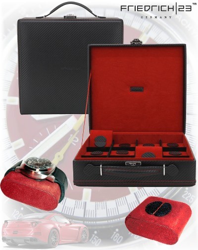 Friedrich|23 briefcase for 12 watches CARBON RACING GT12 reminiscent of motor-racing, the distinctive carbon finish and striking red contrast of these items gives them a stylish and sporty appearance. Dimensions: 27,5 x 10 x 30 cm, weight: 1,6 kg. Friedrich|23 watch boxes, etuis and briefcases offer good workmanship at an excellent price-performance ratio.